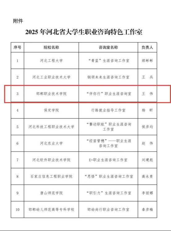 近日,我院“伴你行”生涯咨询工作室依托多年积累的服务经验与体系化建设成果在全省高校中脱颖而出,以总排名第三、高职院校第一的优异成绩,成功入选2025年河北省大学生职业咨询特色工作室,为学院再添光彩!
